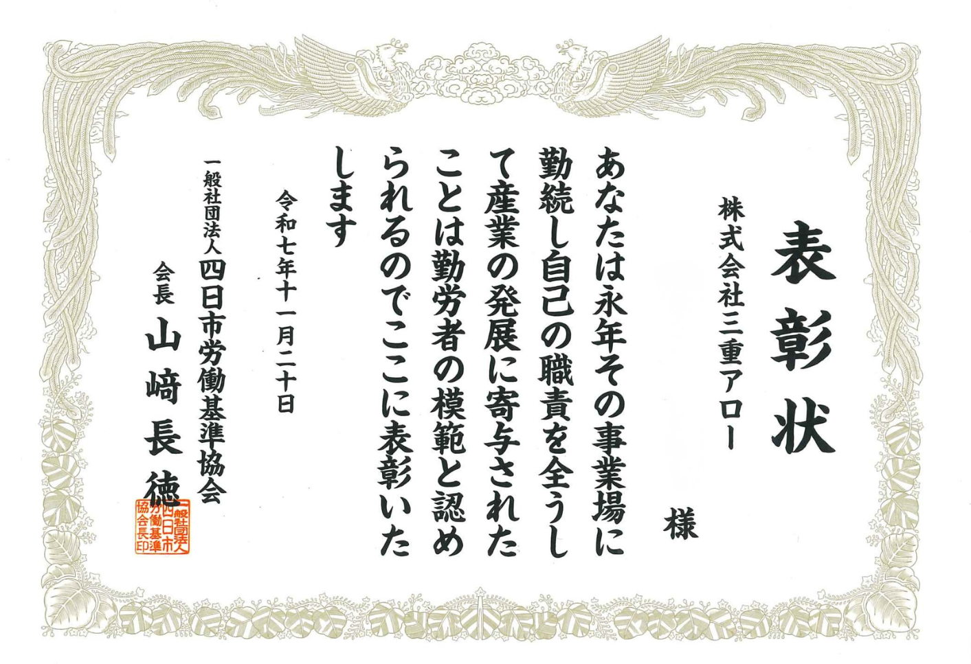 四日市労働基準協会より「優良勤労者表彰」を受けました